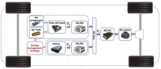 The basic parameters and hybrid powertrain architecture of FCBs are shown in Table 1 and Figure 2. A fuel cell and battery are connected to the DC-bus by unidirectional and bidirectional DC/DC converters, respectively. Energy could be delivered from the battery to the DC-bus, and the DC-bus could also charge the battery when the battery SOC is low. The DC-bus is connected to the electric motor by a DC/AC converter to provide power to the vehicle.