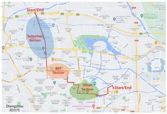 The driving cycle is the time-speed profile of the vehicle. In order to provide a basis for the optimization and simulation of the energy management strategy, it is necessary to construct a driving cycle that meets the operating characteristics of the FCBs. Before the simulation started, the driving data of 10 drivers on the same bus line were collected using GPS terminals. The driving data collection vehicle is a 12 m class FCB, which matches the modeled vehicle, and the bus line is selected as Bus Rapid Transit (BRT) B18 of Zhengzhou Bus Group, and the route is shown in Figure 3. The line is 19.9 km long with 36 bus stops, extending from the northwest to the center of the city and covering a wide range of road types, including suburban roads, BRT, and congestion-prone urban roads. The 10 drivers, including 8 men and 2 women, had an average age of 45 and an average driving experience of 18.5 years. To account for variability in pedestrian flow conditions, data collection was conducted seven days a week, including Monday through Sunday. The data duration reached 37,180 s, with a sampling time of 1 s.