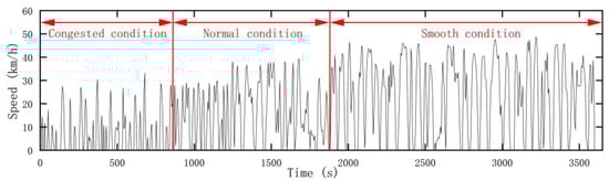 According to the results of the cluster analysis and the operation characteristics of FCBs, a 3600-s driving cycle was constructed, as shown in Figure 4. The working conditions include 830 s of congestion, 1033 s of normal operation, and 1737 s of smooth operation, with average speeds of 7 km/h, 13.74 km/h, and 22.67 km/h, respectively, and maximum speeds of 30 km/h, 40 km/h, and 50 km/h, respectively.