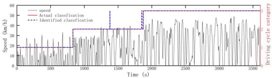 The driving cycle constructed based on the Markov chain is imported into the neural network model for recognition. The results show that the constructed recognizer can identify the current driving conditions very well, as shown in Figure 5.