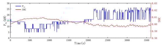 In practical applications, the rule-based control strategy is the most common energy management strategy for FCEVs, which is based on the experience of designers [8]. Deterministic rule-based management strategies include mainly thermostatic control, power following, and state machine control [9]. Li et al. [10] proposed a state machine control strategy based on droop control, which avoids fast changes in output power. The control strategies based on fuzzy logic mainly include optimal fuzzy control, predictive fuzzy control, and adaptive fuzzy control. Zhao [11] proposed a fuzzy logic-based energy management strategy for a multi-energy hybrid power system and improved the fuzzy logic with a dynamic planning algorithm to achieve the optimal distribution of output power. In the study of rule-based management strategies, the power of fuel cells will fluctuate greatly when different rules are switched. Most scholars focus on the reduction in vehicle equivalent hydrogen consumption and the maintenance of battery SOC, ignoring the durability problem caused by fuel cell fluctuation.