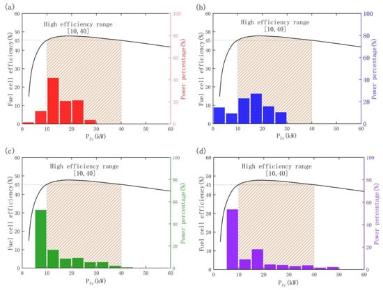 Fuel cell power distribution under different energy management strategies: (a) A-ECMS; (b) ECMS; (c) Fuzzy-logic; (d) State machine.