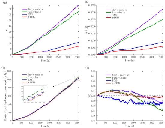 Performance of different energy management strategies on (a) number of fluctuating cycles, (b) fuel cell degradation, (c) equivalent hydrogen consumption, and (d) battery SOC maintenance.
