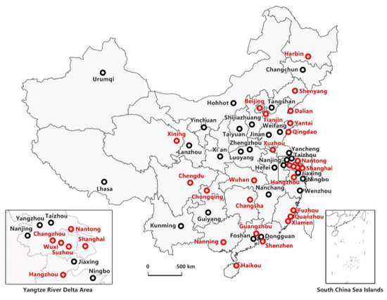 Targeted major cities in China for which comprehensive territorial plans were released by the end of 2021 (in red).