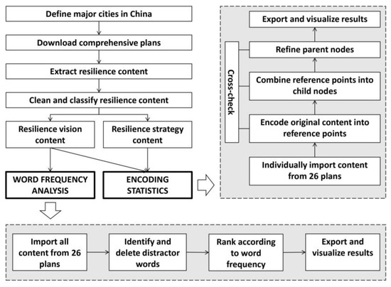 The textual plan materials used in our study were collected from open internet sources, such as local governments’ websites and official WeChat accounts run by their planning/natural resource agencies. We examined the comprehensive plans of all targeted cities and kept track of any revisions or modifications made by the end of 2021. Taking Shenzhen as an example, we conducted searches using “comprehensive territorial plan” as the keywords and downloaded original planning documents from the Shenzhen People’s Government Online Portal and the Shenzhen Bureau of Planning and Natural Resources websites. We took those chapters from the comprehensive plans that concentrated on building urban resilience and prepared them for use in NVivo analysis. For instance, Chapter 9 of Shenzhen’s comprehensive territorial plan comprised 1100 Chinese characters related to resilience. The resilience content was further divided into the resilience vision content and the resilience action content. The resilience vision material comprised chapter headings and urban resilience vision statements, which are descriptions of how different cities perceive urban resilience and portray the future resilience state of their cities [3]. Resilience action material was made up of the remaining text in related chapters.