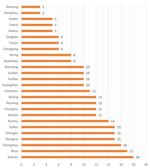 A city was more likely to include more resilience actions in its comprehensive territorial plan when it gave urban resilience more attention. We located 264 resilience actions in all 26 plans, or 10.15 resilience actions per city. This result suggests a relatively high understanding of resilience in plan content. Changzhou (16 actions), Wuxi (17 actions), and Xiamen (18 actions) were the cities with the largest numbers of resilience actions, while Nantong (3 actions) and Hangzhou (3 actions) had the smallest numbers of resilience actions in their plans (Figure 4).