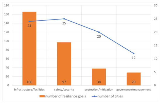 Resilience actions were gathered into four categories: infrastructure/facilities, safety/security, protection/mitigation, and management/governance. The results show that planners are more likely to associate resilience actions with the former two categories, as 24 cities offered 166 resilience actions on infrastructure/facilities and 25 cities propose 99 resilience actions on safety/security. In contrast, only 38 and 29 resilience actions, respectively, were recommended by the 20 cities that valued protection/mitigation and the 12 cities that valued management/governance (Figure 5).