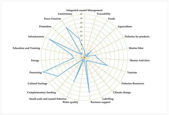 Upon examining the thematic focus of the CLLD strategies implemented during the period of 2014–2020 (extended to 2023), it was found that fish processing (endorsed by 60.6% of the FLAGs) was of high relevance. This follows the “support to business” (endorsed by 54.5% of the respondents), the need for infrastructure (54.5%), the promotion of fishing tourism (48.5%), and the promotion of cultural heritage (45.5%).