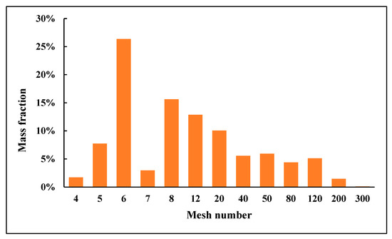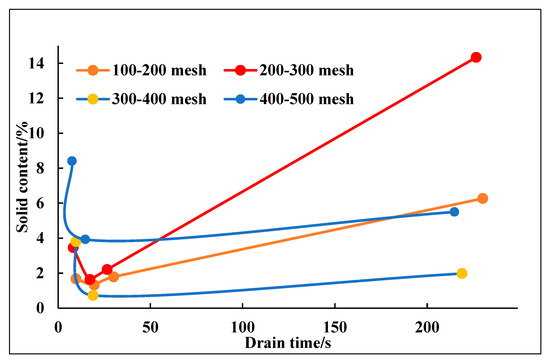 According to the analysis results of the particle size distribution in Section 2.2, the particle sizes of 100–200 mesh, 200–300 mesh, 300–400 mesh and 400–500 mesh were selected for the experiments. The experimental results are shown in Figure 11 below.