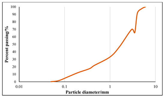 At present, there are many methods to determine the particle size of rocks and minerals. Among them, the simplest and most widely used is the screening method, which can not only measure the particle size distribution but also draw the cumulative particle size distribution curve through the measured data so as to analyze the particle size distribution of the samples [27]. In this experiment, the sieving method was used to determine the particle size distribution of the sediment at the bottom of the cavity, and the experimental results are shown in Table 3 and Figure 3. Figure 4 shows the gain size distribution curve after the mesh number is converted to particle size.