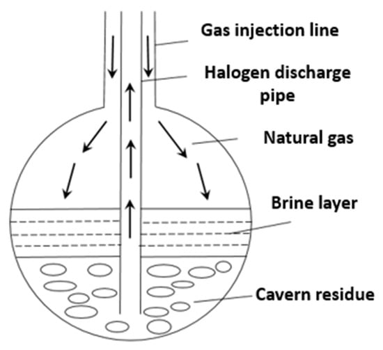 Gas injection and brine drainage is the last step in the construction of salt cavern gas storage. High pressure is used to inject natural gas through pipelines from the ground. When the gas injection pressure is greater than the pressure in the gas storage chamber, the brine in the chamber is expelled from the brine drainage pipe [29]. In the leaching process of the cavern, the insoluble mud interlayer collapses and settles at the bottom to form loose sediment, which cannot be carried to the ground with the movement of brine. According to the sonar data of salt cavern gas storage, the volume of settling residues at the bottom accounts for 45% of the volume of the salt cavern. The thickness of the remaining brine layer above the residues is about 2~5 m. In order to expel the brine in the cavity as much as possible, it is necessary to increase the depth of the brine drainage pipe [30,31].