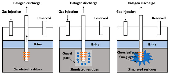 In the secondary brine drainage experiment, the brine drainage tube goes deep into the bottom of the salt cavern. Under high pressure, the insoluble particles move to the brine drainage pipe, which can easily cause pipeline blockage [38]. Therefore, it is necessary to evaluate the sand production rules of three kinds of sand control methods, namely, screen pipe, gravel pack artificial well wall and chemical sand consolidation. Figure 6 below shows the simulation diagram of three kinds of sand control technologies.