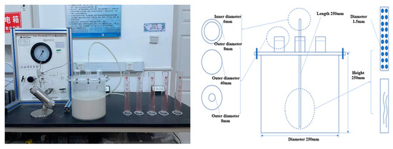 The experimental device includes a high-pressure gas bottle, pressure gauge, cave simulation device, measuring cylinder and timer. Nitrogen is used because it is relatively safer than natural gas. Most of the salt caverns are elliptical, so the experimental device is designed as a cylinder. The brine drainage time is recorded with a stopwatch, the sand production is filtered, dried and weighed by a balance, and the volume of brine is recorded with a measuring cylinder, which is a convenient and fast method. See Figure 7 below.