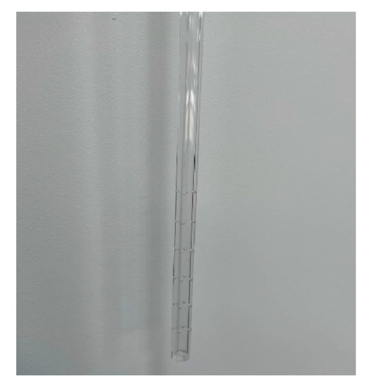 In this section, the sand production simulation experiment of secondary gas injection was carried out. A simulation screen with a size 200 times smaller than field conditions was used [39,40]. The acrylic pipe was perforated in advance, with a diameter of 0.15 cm and a total of 40 holes. According to the particle size distribution results obtained in Section 2.1.1. Experimental material, different sizes of quartz are combined according to the ratio from Section 2.2. As shown in Figure 8. We drilled holes spaced 1 cm apart, 3 in a row, for a total of 30 holes.
