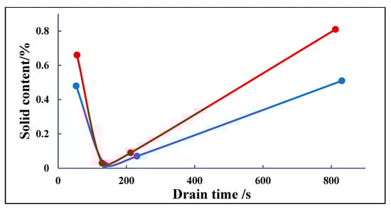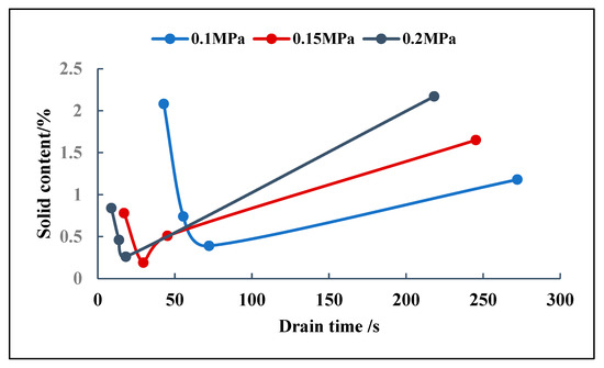 The gas injection pressure was designed to be 0.1 MPa, 0.15 MPa and 0.2 MPa for the experiment. Parameters such as drainage time, drainage volume and quantity of sand production were recorded, and the sand content of the expelled brine was calculated. The experimental results are shown in Figure 9.