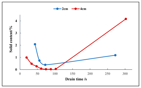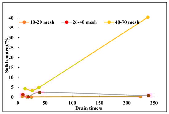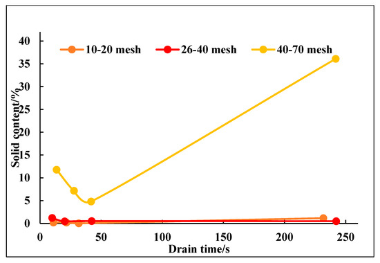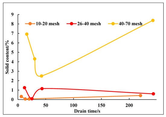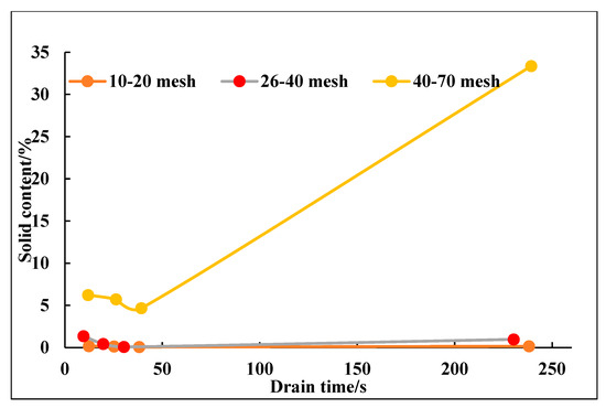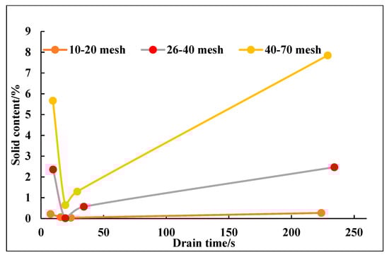 It can be seen from Figure 21 that sand control by different chemical cementing agents shows a similar trend over time. In the beginning, the solid content is high, and with the change in time, the solid content decreases. This is because the brine layer under gas pressure is gradually compacted, and sand production is gradually reduced. When the brine layer is nearly exhausted, the brine in the pores of rock particles is expelled by the gas–brine mixture. The flow rate is faster, the brine production decreases and thus the sand content increases gradually. The two curves almost have the same trend as before.