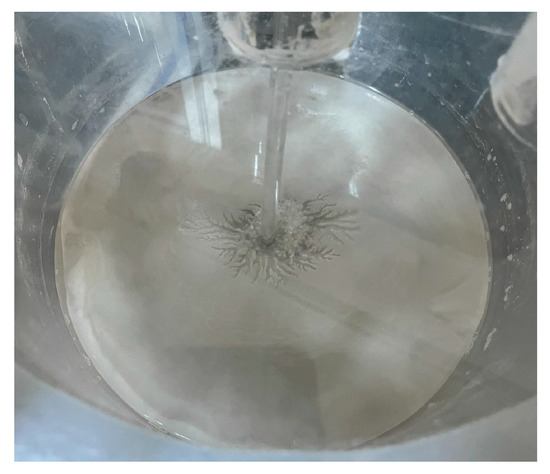 By comparing the drainage time when the injection pressure is 0.1 MPa, 0.15 MPa and 0.2 MPa, it can be shown that the injection pressure affects the drainage speed. The higher the pressure, the faster the drainage speed. However, the total amount of the discharged liquid basically does not change, and the total volume is about 810 mL. The total amount of brine added is about 3500 mL, so about 23.1% of the brine is removed. All three curves showed a descending trend at the beginning and ascending trend at the later stage. With the increase in gas injection pressure, the compaction speed of rock powder is accelerated, which is conducive to reducing the initial sand production amount of rock powder. However, due to the faster gas flow rate in the later gas–liquid discharge, the final sand content also increases. Since the total amount of liquid drainage is basically constant, the total amount of sand production increases under high pressure. According to the experimental results, we believe that sand production can be reduced by reducing the gas-injected pressure. In the following study, the preferred experimental parameter of gas injection pressure is set to 0.1 MPa.