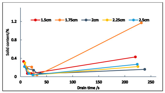 When the gravel is packed around the brine drainage string, a sand control layer is formed around the pipe, and it is called an artificial well wall. The artificial well wall is between the formation sand and the brine drainage pipe to isolate the formation sand and the screen. The thickness of the artificial well wall has a great influence on the brine drainage and sand control [42]. This experiment mainly explores the influence of different artificial well wall thicknesses on brine drainage and sand control. As previously mentioned, the artificial well wall thickness is designed to be 1.5 cm, 1.75 cm, 2 cm, 2.25 cm and 2.5 cm. The experimental results are shown in Figure 17, Figure 18, Figure 19 and Figure 20 below.