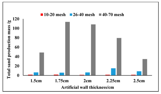 As can be seen from Figure 18, Figure 19 and Figure 20, under the condition of the same gravel size, the sand content with different artificial well wall thicknesses changes with time basically in the same way, first decreasing and then increasing. Comparing the sand content of the brine, the condition of 40~70 mesh gravel is far greater than that of 26~40 mesh gravel regardless of artificial well wall thickness. The sand production of 26~40 mesh gravel is also significantly greater than that of 10~20 mesh gravel, which again shows that the larger the particle size of the gravel pack, the better the sand control. Under the condition of gravel packing with the same particle size, the trend of sand content with different artificial wall thicknesses is not obvious. The general trend is that the thicker the artificial wall thickness, the better the sand control.