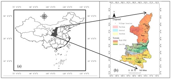 The traditional villages selected for the study were Shaanxi Province (105°29′–111°15′ E and 31°42′–39°35′ N) (Figure 1a), located in northwestern China, which is usually divided into three parts, including southern Shaanxi, central Shaanxi, and northern Shaanxi, due to its geographical variation. The topography of the southern Shaanxi region is complex and mountainous, with an average elevation between 1000 m and 3000 m. The population density in this region is low, with 121 persons per square kilometer. Their ancestors came here from different areas about 300 years ago to avoid war or famine. Therefore, this region is a mixed place of multiple traditional cultures. The landform of central Shaanxi is plain with an average elevation above 500 m, and the region has a high population density of 300~750 persons per square kilometer. Due to its superior location and proximity to the Weihe River, the region is one of the origins of Chinese civilization. As a result, the region has a long and rich traditional village and rural culture. Northern Shaanxi is a Loess Plateau region with an average altitude of 800 to 1300 m. The region has a lower population density of 57 persons per square kilometer. Historically, this region was a multi-ethnic area, and its traditional houses display unique ethnic styles and local cultural characteristics.