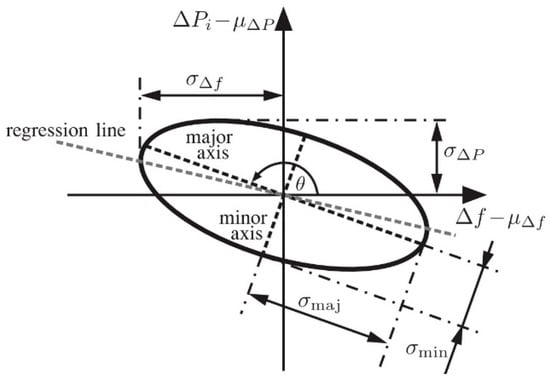 where and present the standard deviations, and stands for the correlation coefficient. The central coordinates of the ellipse are defined by , and the principal axes lie in the directions of the eigenvectors Σ []. The principle is shown in Figure 2.