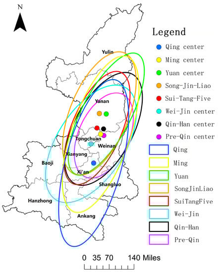 Figure 5 shows a trend of SDE coordinate centers from 109°37′ E, 35°17′ N in the Pre-Qin period to 109° 27′ E, 36°2′ N in the Song, Liao, and Jin periods and then to 109°13′ E, 34°22′ N in the Qing period. The east–west span from Pre-Qin to Song, Liao, and Jin is about 0.1°, and the south–north span is about 1.03°, which shows a distribution trend of traditional villages migration from south to north in this period. The east–west span from Song, Liao, and Jin to Qing is about 0.14°, and the north–south span is about 1.98°. The results show that the traditional village changes in this period showed a migration trend from central Shaanxi to northern Shaanxi and then to southern Shaanxi. We can see clearly that the spatial distribution of traditional villages in Shaanxi Province in different historical periods is relatively concentrated.