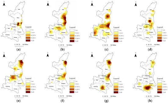 Kernel density distribution of traditional villages in different periods. (a) Pre-Qin, (b) Qin–Han, (c) Wei–Jin, (d) Sui–Tang–Five, (e) Song–Jin–Liao, (f) Yuan, (g) Ming, (h) Qing.