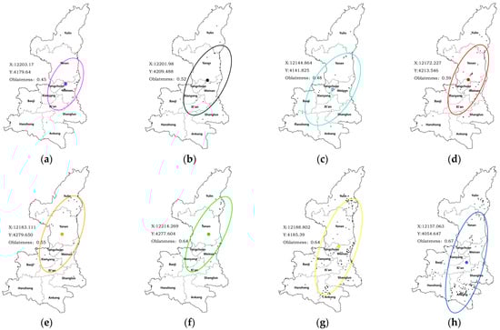 The standard deviation ellipse (SDE) is a model that quantitatively explains the centrality, orientation, and spatial distribution of geographic elements from a spatial perspective based on the location and structure of the object and is used to explore the spatial distribution and evolution process of geographic elements []. An ellipse can provide a simple, bivariate relationship structure [], when a standard deviation ellipse is obtained using a confidence level of one standard deviation [], which can be calculated by the averaging vector values with the following covariance matrix: