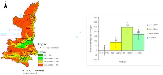 Altitude is an important factor and indicator for quantitative research on traditional villages. Therefore, to quantitatively evaluate the effects of altitudes on the spatial distribution features of Shaanxi traditional villages, the surface analysis slope tool and the reclassification by natural break tool were used to explore the distribution pattern (Figure 8). We concluded that only 85 traditional villages were distributed at altitudes lower than 500 m, accounting for about 17%. In addition, 83% of the traditional villages are located in areas above 500 m above sea level; especially, 170 traditional villages were scattered more than 1000 m above sea level, accounting for 34%. Therefore, it can be concluded that the higher the altitude is, the greater the number of traditional villages is, indicating that the spatial distribution of traditional villages in Shaanxi Province is positively correlated with altitude.