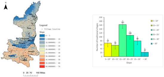 To explore the spatial distribution correlation between slope and traditional villages in Shaanxi Province, we extracted slope parameters using the ArcGIS 10.8 slope analysis too, reclassified them according to the slope criteria of construction land, and then overlaid them on the traditional village distribution map (Figure 9). The results show that 69 traditional villages are located in a moderate zone with slope less than 10°; 58 traditional villages are located in the zone with slope of 10–15°, accounting for 11.6% of the total. Meanwhile, we also found that 163 and 108 traditional villages are located on high slopes between 15–20° and 20–25°, accounting for 32.6% and 21.6%, respectively. The number of traditional villages with slope greater than 25° is 102, accounting for 20.4% of the total. Therefore, 373 traditional villages with slopes greater than 15°, accounting for 74.6%, are located in the northern and southern Shaanxi regions, indicating that traditional villages in Shaanxi Province tend to be situated on high-gradient slopes, especially in the Qinba mountains in southern Shaanxi and the Loess Plateau in northern Shaanxi areas.