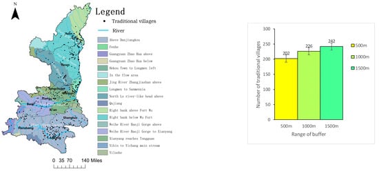 We used the ArcGIS 10.8 spatial analysis buffer tool to obtain river maps and overlay them on the traditional village distribution layer (Figure 10). The results show that the traditional villages in Shaanxi Province are mainly distributed along these rivers; especially, 25%, 24%, and 35% of the total number are mainly distributed along the Wuding River, Weihe River, and Hanjiang, and others are located near the Luohe River and Jinghe River. It can be concluded that 61, 226, and 242 traditional villages are distributed within 1000 m, 2000 m, and 3000 m of rivers, accounting for 12%, 45%, and 48%, respectively. Overall, the distribution of traditional villages near water resources was clustered and mostly set in mountains areas. This is consistent with the findings of Chen Qiaoting et al.