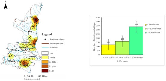 The natural breaks method was used to classify the major road networks in Shaanxi Province, and then, it was superimposed on the traditional village layer (Figure 11). As shown in Figure 11, the results show that 162 traditional villages are located within the 10 km buffer zone of ancient post roads in Shaanxi Province, accounting for 32.4% of the total, while the remaining 338 traditional villages are distributed outside the 10 km buffer zone, accounting for 67.6%. One may conclude that the choice of location of traditional villages in Shaanxi Province is not entirely around the ancient post roads, and only a few traditional villages are found to be concentrated around the ancient portage route, accounting for about 25% of the total. For example, the villages of Mizhi and Suide Counties are clustered at the intersection of the Suide ancient portage route. This spatial phenomenon suggests that they seldom considered the traffic of the ancient portage route when they first established the villages. This may be because the traffic of ancient post roads was built later according to the distribution of villages and the convenience of landforms.