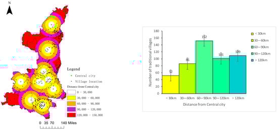 Distribution of distance between traditional villages and central cities in Shaanxi province.