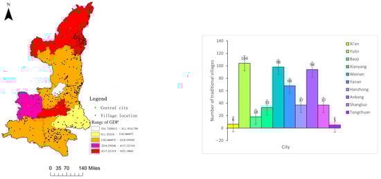According to Figure 13, regional GDP and the number of traditional villages fluctuate. About 78% of traditional villages are located in regions with GDPs below 250 billion RMB; Weinan, Yan’an, and Ankang only account for 76%, 65%, and 46% of the province’s average GDP. However, the number of traditional villages is more distributed in these regions, accounting for 19.6%, 13.6%, and 18.8%, respectively. According to this study, the majority of traditional villages in Shaanxi Province are located in relatively underdeveloped economic areas and are relatively unaffected by external economic influences. This can provide a solid foundation for the preservation and retention of the material elements, cultural customs, and lifestyles of traditional villages.