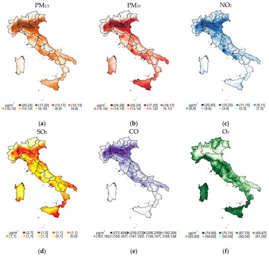 Average concentration of pollutants in Italian municipalities (January 2018–May 2020). Legend: (a) PM2.5: particulate matter with diameter < 2.5 µm (µg/m3); (b) PM10: particulate matter with diameter < 10 µm (µg/m3); (c) NO2: nitrogen dioxide (µg/m3); (d) SO2: sulphur dioxide (µg/m3); (e) CO: carbon monoxide (µg/m3); (f) O3: ozone (µg/m3).