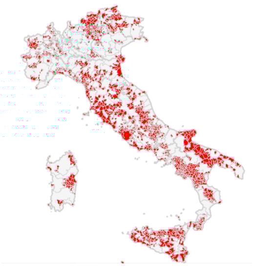 The geographical distribution of national parks in Italy (as of 2020). Red dots indicate municipalities located in national parks.