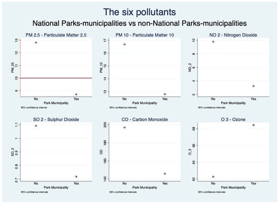 In Figure 2, we show how national parks are distributed throughout the country, and in Table 2 we show descriptive differences in pollutant levels between park and non-park, with 95 percent confidence intervals. We observed that the PM concentration was one-third lower in park municipalities for PM2.5 and one-fourth lower for PM10. In both cases, we observed a difference of approximately 4 µg/m3 (8.71 µg/m3 vs. 12.82 µg/m3 for PM2.5, and 12.81 µg/m3 vs. 16.68 µg/m3 for PM10). The levels of pollution for non-park municipalities lay above the WHO threshold (i.e., 10 µg/m3), while the same levels for park municipalities lay below it. Levels of SO2 and CO were also around one-fourth lower. However, the largest difference was in terms of NO2 levels, which were three times higher in non-park than in park municipalities (3.25 µg/m3 vs. 9.79 µg/m3), even though they were well-below the WHO threshold of 40 µg/m3. The level of the main air pollutants in the parks was higher than that of non-park municipalities only for O3 (68.4 µg/m3 vs. 62.3 µg/m3), but both levels were well-below the WHO threshold of 100 µg/m3. The difference in mean air pollution levels between park and non-park municipalities was significant at the 95 percent level for all six pollutants (Figure 3). More clearly, the difference between park and non-park municipalities can be shown using air quality maps (PM2.5, PM10, and NO2) for the 12 largest Italian parks and their neighbouring councils (Figure 4).