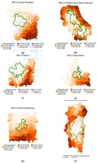 Air quality in the 12 main Italian national parks—PM2.5. (a) Gargano and Alta Murgia; (b) Appennino Tosco Emiliano and Cinque Terre; (c) Aspromonte; (d) Foreste Casentinesi and Monte Falterona; (e) Cilento, Val d’Agri, Pollino and Sila; subfigure (f) Circeo; (g) Gran Paradiso; (h) Sibililini Gran Sasso Abbruzzi; subfigure (i) Stelvio; subfigure (j) Val Grande; (k) Dolomiti Bellunesi; subfigure (l) Gulf of Orosei and Gennergentu.