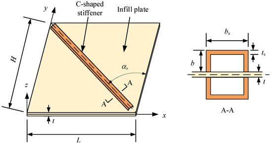 Stiffened plates are widely utilized in various fields such as civil engineering, automotive, shipbuilding, and aerospace [1,2,3]. The current research focuses on the buckling stability of stiffened plates under in-plane loading [4,5,6,7,8]. In structural engineering, stiffeners are used in beams, plates, shear walls, and other major structural members to improve structural performance [9]. The common forms of stiffened plates include transverse, longitudinal, and diagonal. In 1960, Timoshenko and Gere [10] systematically studied the buckling behavior of rectangular plates and derived the equilibrium equations of rectangular plates under single loads such as compression, bending, and shear. In addition, the relationship between flexure rigidity of stiffeners and critical buckling stress was analyzed for transversely and longitudinally stiffened plates, and the limit of the stiffness ratio was given, thus establishing the foundation for the research of buckling stability of stiffened plates. Mikami [11] and Yonezawa [12] investigated the buckling behavior of diagonally stiffened plates simply supported on four edges. Yuan et al. [13] considered the flexural rigidity of the open diagonal stiffeners, and studied the shear behavior of diagonally stiffened stainless-steel girders using the finite element (FE) software. Martins and Cardoso [14] also investigated how the torsional stiffness of closed-section stiffeners affects the shear buckling behavior of diagonally stiffened plates.