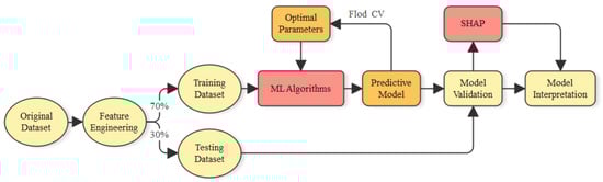 The dataset was divided into 70% training sets and 30% test sets. All the features were standardized using Equation (25) to make the scales of features uniform. Then, ML algorithms were used to train the model, and the ten-fold cross-validation method (CV10) and random search hyperparameters were used to optimize the predicted model. The 10-fold cross-validation is based on the original training set and divided into new training and validation sets. The ML model was trained using multiple cycles of replacing the training and validation sets, and the results were averaged ten times. The optimal hyperparameters were selected to obtain better performance and generalization. There are two main methods for hyperparameter optimization, including grid search and random search. Among them, grid search aims to search all possible parameter ranges. It is an exhaustive search method, with search time increasing exponentially related to the number of parameters. The random search method takes random sampling in the appropriate parameter space and gradually approaches the optimal parameters.