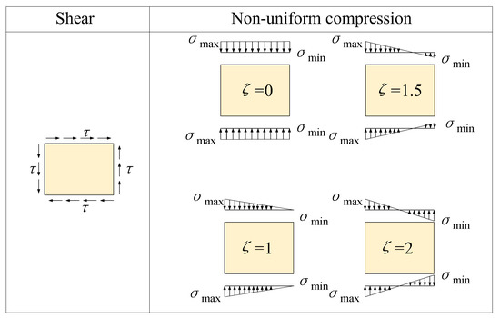 Tong [28] analyzed the buckling stability of a four-edge simply supported plate under combined shear and non-uniform compression, resulting in the interaction formula for the plate combined action of axial compression, bending, and shear as Equation (5). It is possible to separate the non-uniform compression into a combined bending and axial compression action. A coefficient is defined to represent the form of the distribution of non-uniform axial compression. The distribution factor of non-uniform compression ζ is shown in Equation (7). More information is detailed later in Section 3.3.