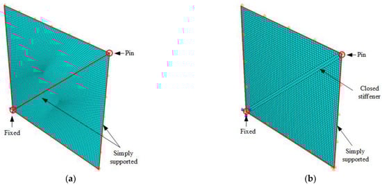 Compared with the stiffeners arranged on the tension diagonal, stiffeners arranged on the compression diagonal have a higher buckling load and have a more significant effect on the elastic buckling coefficient [14,29]. Therefore, the subsequent study mainly focused on the stiffened plate over the compression diagonal. Two types of models were used to study the four-edge simply supported plate with compression diagonal stiffener. All of the models were built in the finite element software ABAQUS. The corners of the plate were fixed to prevent movement and the out-of-plane displacements of the four edges were constrained to simulate simple support. Shear and non-uniform compression loads were applied at the edges of the plate.