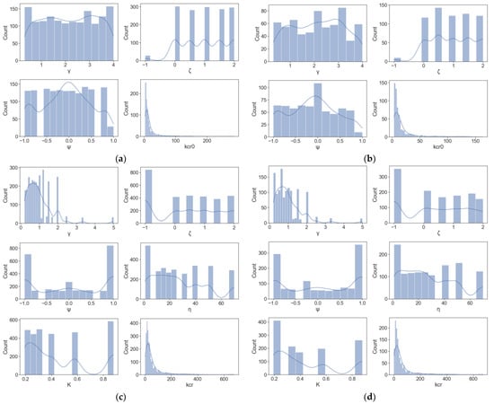 Distributions of variables of the dataset. (a) Distributions of variables of the Type-1 training set; (b) Distributions of variables of the Type-1 test set; (c) Distributions of variables of the Type-2 training set; (d) Distributions of variables of the Type-2 test set.