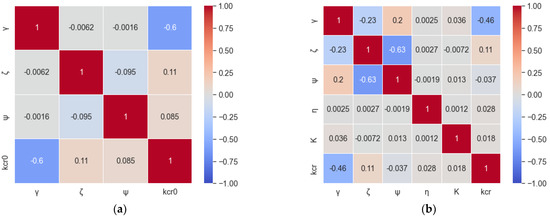 Correlation matrix heat map of features for the buckling coefficient dataset. (a) Correlation matrix of the Type-1 dataset; (b) Correlation matrix of the Type-2 dataset.