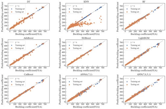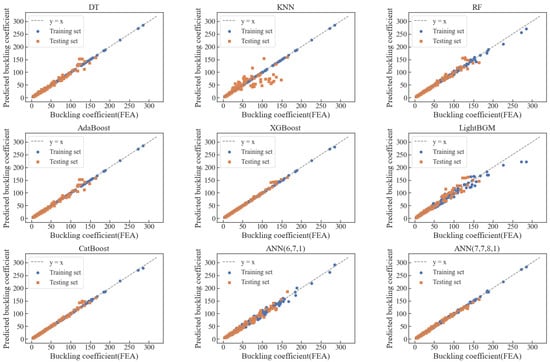 All established ML models were implemented in Python. Various machine learning models were trained in the same training set. The developed ML models were obtained by using a 10-fold cross-validation method and random hyperparameter search. Table 5 contains the hyperparameters of each ML algorithm. Figure 8 and Figure 9 demonstrate the ML model’s predictions for Type-1 and Type-2, and compare the prediction values with the finite element results on the training and test datasets.