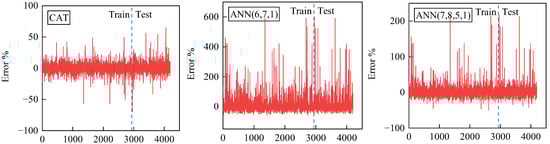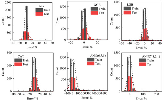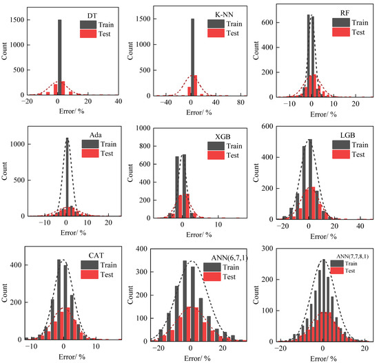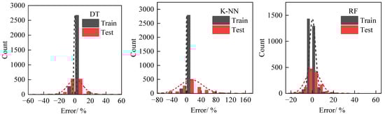Figure 10, Figure 11, Figure 12 and Figure 13 show the error frequency diagrams and error histogram distribution for each machine-learning model. Different machine learning algorithms have different distributions of target predictions. DT and KNN suffered from overfitting in the Type-1 training set and had large errors in the prediction results in the test set. ANN had larger errors in the Type-2 dataset. In contrast, integrated learning algorithms such as XGBoost had smaller and more uniform errors in both the training and test sets.