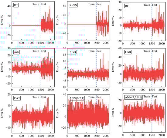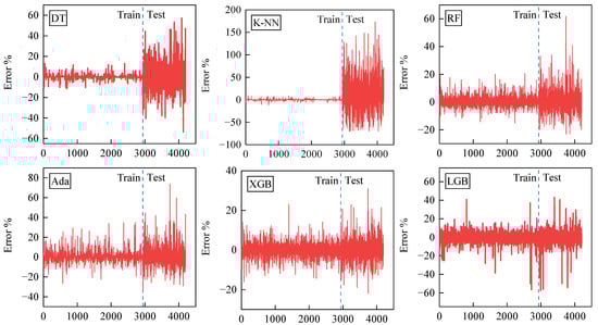 Figure 14 illustrates the U95 for the different models, a parameter of the uncertainty analysis, indicating a 95 percent confidence level [21]. In Figure 14a, DT and K-NN model’s U95-train = 0, but U95-test = 5.88 and U95-test = 20.05, respectively. The U95 of the other models ranged from 0 to 10, among which the U95-train = 0.46 of AdaBoost and U95-test = 2.86 of XGBoost are the lowest. In Figure 14b, U95-test = 108.98 of the K-NN model is significantly larger than others. The U95 of the other models was under 20, among which the U95-train = 2.55 of AdaBoost and U95-test = 11.18 of XGBoost were the lowest.