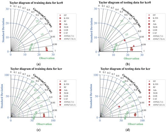 Taylor diagram of training and testing data for kcr0 and kcr. (a) Taylor diagram of training data for kcr0; (b) Taylor diagram of testing data for kcr0; (c) Taylor diagram of training data for kcr; (d) Taylor diagram of testing data for kcr.