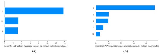 Figure 16 illustrates the SHAP value of global feature importance, where the importance of each feature is regarded as the mean absolute value of that feature on all given samples. Among the three features in Figure 16a, the effect of aspect ratio γ on the critical buckling coefficient of the diagonally stiffened plate was the most important, which was expected. Its SHAP value was significantly higher than the non-uniform compression distribution factor ζ and the compression-to-shear ratio ψ. The Type-2 model has two additional features than the Type-1 model, and the two features are flexural rigidity and torsional rigidity of stiffeners. Among these five features of the Type-2 model, the aspect ratio γ is still the most important feature affecting the critical buckling coefficient of the structure. Its SHAP value was significantly higher than that of the other four features. The stiffener’s torsional-to-flexural stiffness ratio K was the lowest SHAP importance value among the five features.