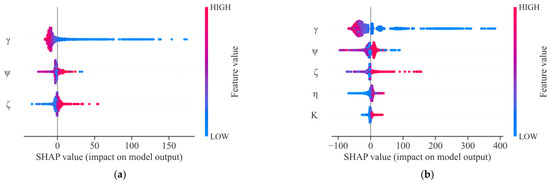 Each point on the SHAP summary plots represents the SHAP value of the sample in Figure 17. The color of each dot displayed from low (blue) to high (red) represents the corresponding feature value from small to large. The SHAP value represents the positive and negative correlation between the feature and the output. For example, a low γ in blue has a high positive SHAP value in Figure 17a, whereas a high γ in red has a negative SHAP value. The trend of ζ is opposite to that of γ, indicating that axial compression will reduce the buckling coefficient and bending will increase the buckling coefficient. In Figure 17b, the higher the η and K values are, the greater the positive SHAP values. The increased stiffness of the stiffener will indeed increase the buckling load of the diagonally stiffened plate.